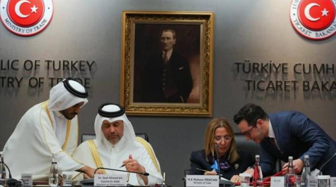 واستقبلت وزيرة التجارة التركية روهصار بكجان، في مقر الوزارة بالعاصمة أنقرة، وزير الاقتصاد والتجارة القطري أحمد بن محمد بن جاسم آل ثاني، للتوقيع بالأحرف الأولى على الاتفاقية.