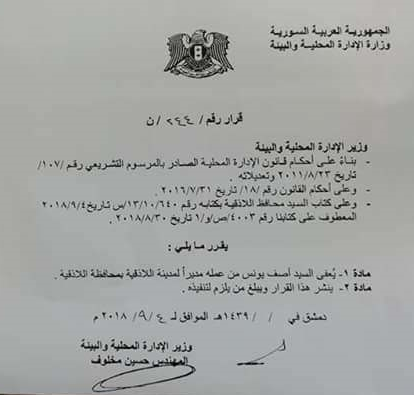 تناقلت وسائل إعلام محلية في الساحل السوري خبر إعفاء "آصف يونس"، مدير مدينة اللاذقية، من منصبه. وحملت ردود الأفعال على الخبر الكثير من إشارات الاستفهام، ولم تخلُ من الشتائم لـ "دولة الواسطة والتشبيح"، حسب ما ورد في التعليقات على مواقع التواصل الاجتماعي.