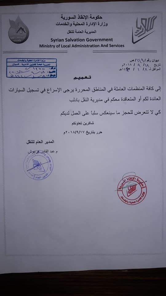 أصدرت المديرية العامة للنقل، التابعة لحكومة "الإنقاذ" في مدينة إدلب، قراراً بالحجز على السيارات التابعة للمنظمات الإنسانية المتخلفة عن عملية الترسيم التي تشرف عليها المديرية بالتعاون مع فرع المرور، وذلك بعد عدة حملات قامت بها الحكومة لترسيم السيارات بغية ضبط وتنظيم حركة المرور في المناطق المحررة وفق تعبير مسؤولين في الحكومة.
