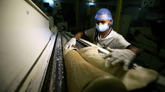 وبينما عمال مصنعه منهمكون في تغليف قطع حلوى داخل آنية بلاستيكية، وهم يضعون كمامات ويغطون أيديهم بقفازات، يشير الى أن مئات المصانع أغلقت أبوابها.