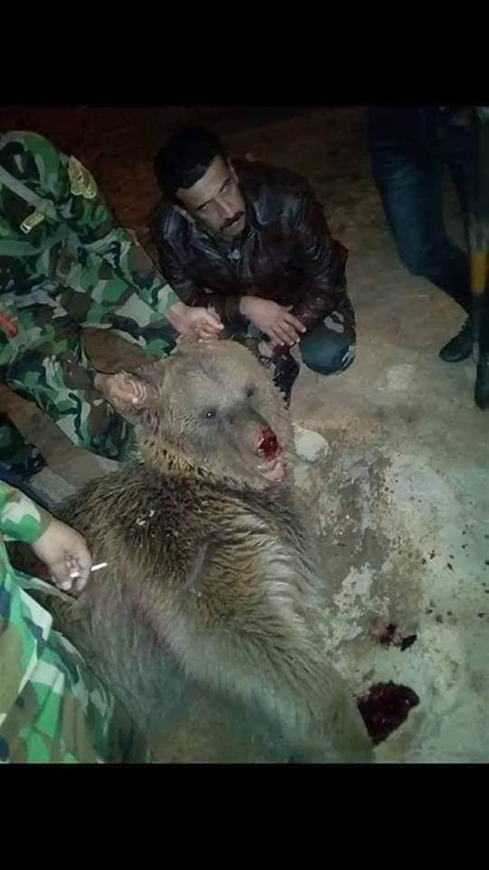 وتناقلت وسائل التواصل الاجتماعي منذ أيام صوراً لدب بني ملقاً على الأرض والدماء تملأ وجهه وجسده بعد قتله، مشيرة إلى أن الدب هرب من إحدى المزارع حيث تربى، باتجاه نهر الفرات، وأشار ناشطون إلى أن دورية استكشافية رأت الدب على ضوء السيارة فتم رميه بالرصاص.