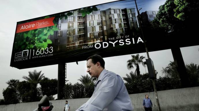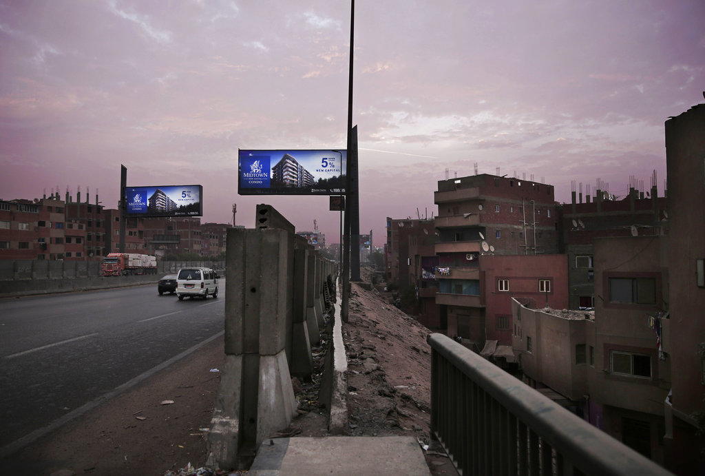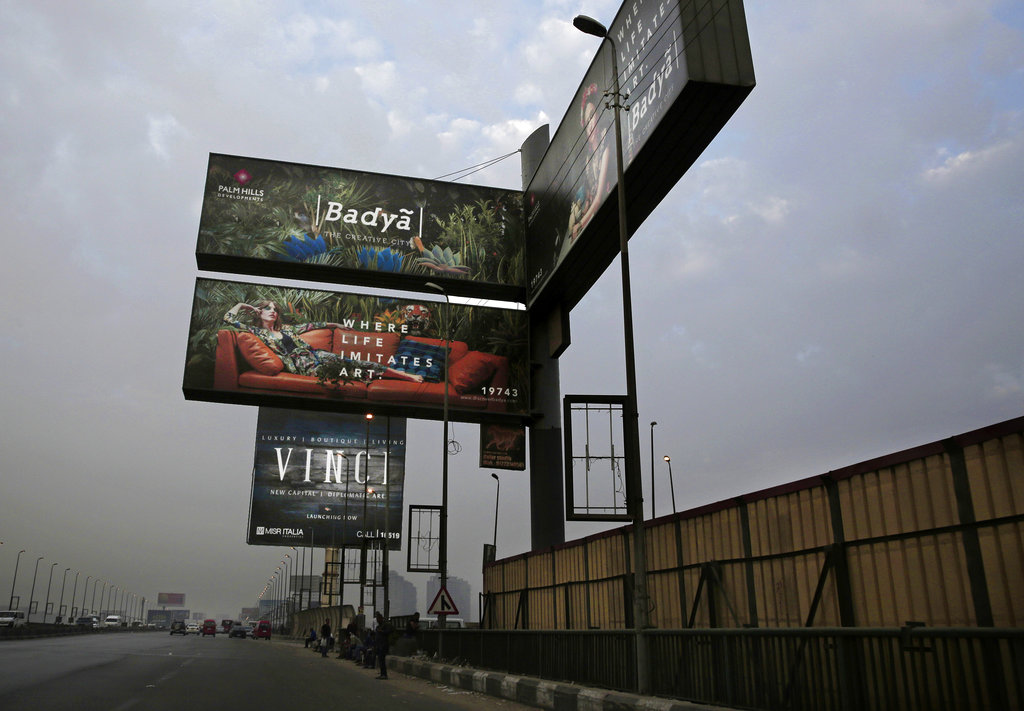 تروج لافتات إعلانية ضخمة في أنحاء القاهرة لمنازل فاخرة بمناظر "خلابة" في مجمعات سكنية تحمل أسماء "لا فيردي" أو "فينشي" في عاصمة مصر الجديدة، قيد الإنشاء في الصحراء على بعد أميال من المدينة الواقعة على ضفتي النيل والتي بقيت مقر السلطة لأكثر من ألف سنة.