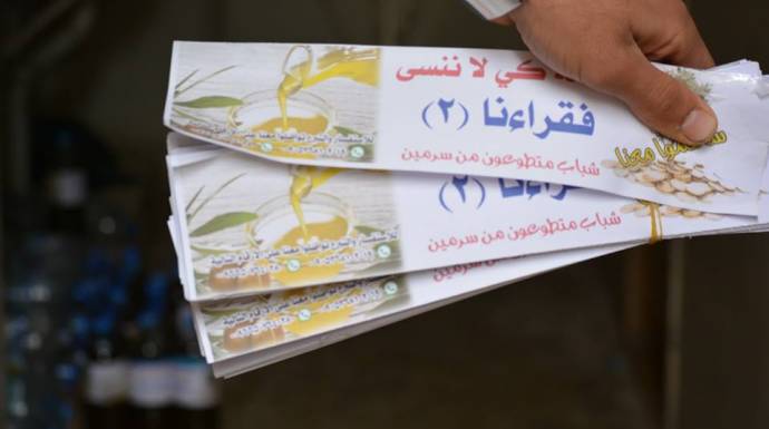ويقول "سعد"، متطوع بالحملة، "قمنا بوضع كالونات فارغة في كل معاصر الزيتون في البلدة ليضع فيها أصحاب الزيت عدد من اللترات ستوزع على المحتاجين".