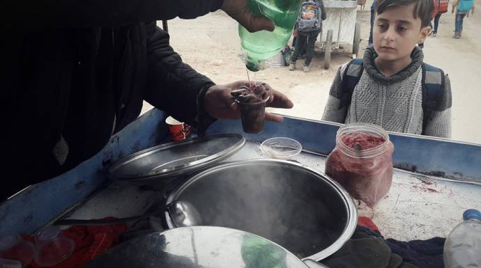 على يمين باب المدرسة في إحدى قرى إدلب يقف العم بعربته ينتظر قدوم الأطفال في الصباح وانصرافهم بعد الظهر. "بين قدوم الأطفال وانصرافهم أمضي الوقت بجولة في المدينة"، قال "أبو محمد" وهو يصب كأساً من السحلب لأحد الصبية، وتابع "أحب مهنتي المتواضعة فأن أرى الأطفال من حولي سعداء، هو أمر يسرني".