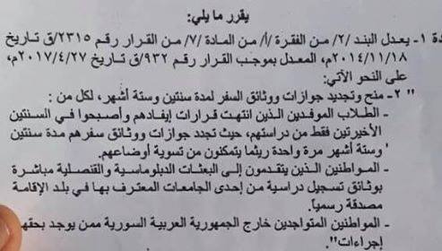 تداولت مواقع إعلامية موالية للنظام، صوراً لقرار قالت إنه صدر عن وزارة الداخلية، ويسمح بتجديد صلاحية جواز السفر لمدة سنتين ونصف بدلاً من سنتين. ولكن لا يستفيد من هذا القرار سوى ثلاث حالات هي: