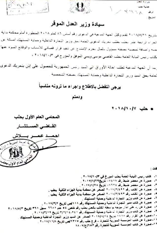 بحسب الصحيفة فإن الوثيقة هي: "دعوى تقدم بها المدعي بتاريخ 27/5/2018 وهي تحمل رقم 86 لعام 2018 منظورة أمام محكمة بداية الجزاء الرابعة بحق وزير التجارة الداخلية وحماية المستهلك أصالة عن نفسه وإضافة لمنصبه بصفته مسؤول بالمال بجرم الامتناع عن تنفيذ قرار قضائي".