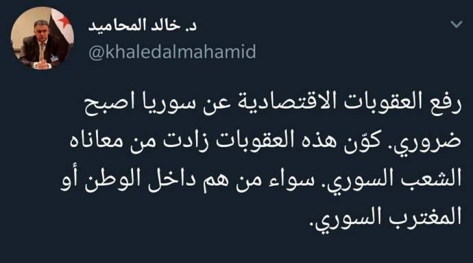 تناقل نشطاء تغريدة لرجل الأعمال والمعارض السابق، خالد المحاميد، يطالب فيها برفع العقوبات الدولية عن النظام السوري.