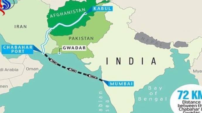 ويجري تطوير مجمع ميناء جابهار على ساحل إيران الواقع على خليج عمان بدعم من الهند ليكون ممرا للنقل لأفغانستان وهي دولة داخلية لا تطل على بحار.