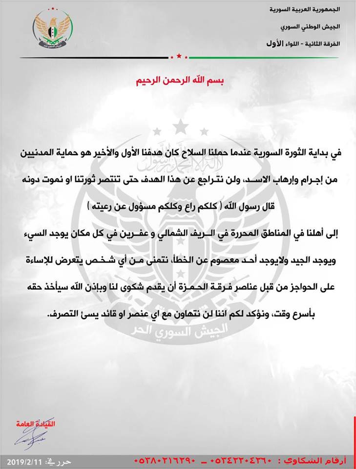 أصدرت إحدى فرق "الجيش الوطني السوري"، بياناً تدعو فيه المدنيين في مناطق ريف حلب الشمالي وعفرين إلى التواصل مع قيادة الفرقة، في حال التعرض لأي إساءة، على حواجزها المتواجدة في المنطقة.