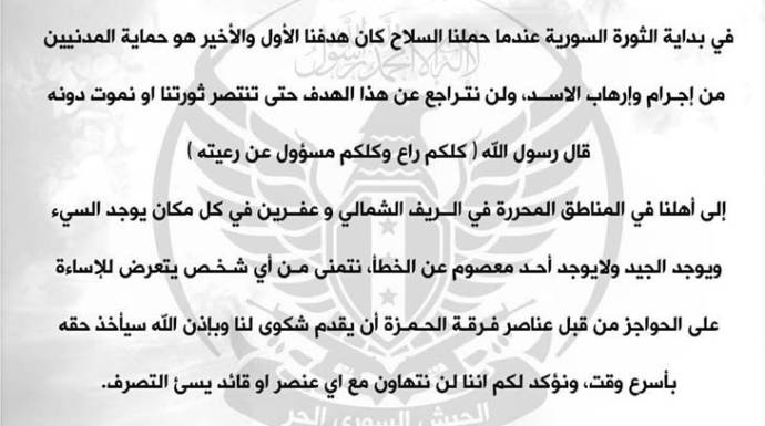 أصدرت إحدى فرق "الجيش الوطني السوري"، بياناً تدعو فيه المدنيين في مناطق ريف حلب الشمالي وعفرين إلى التواصل مع قيادة الفرقة، في حال التعرض لأي إساءة، على حواجزها المتواجدة في المنطقة.