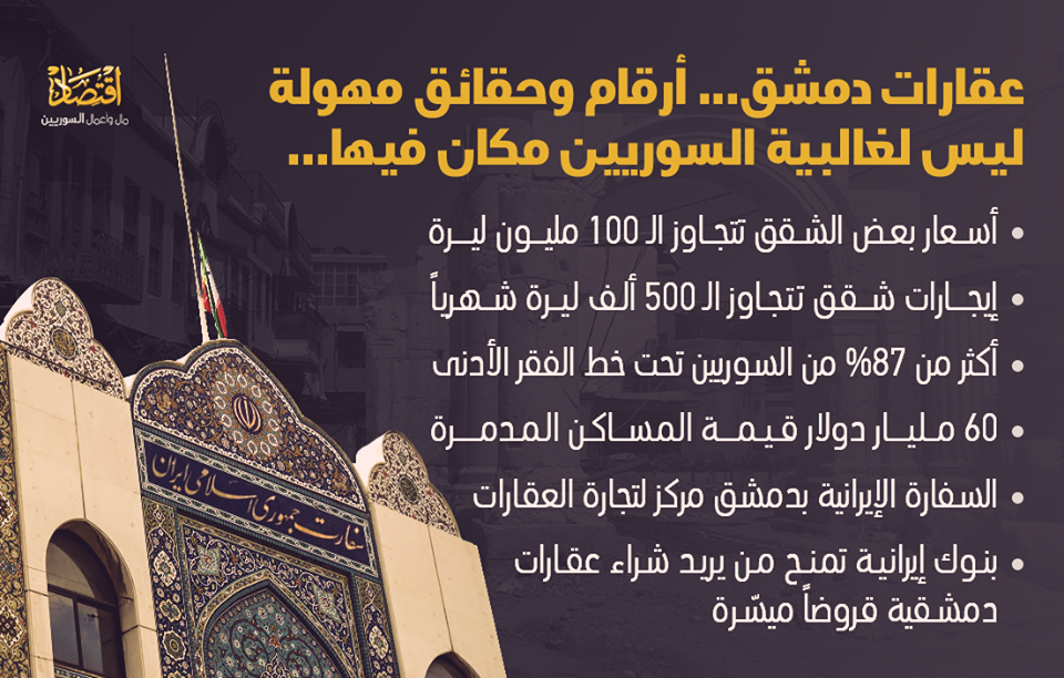 وقالت صحيفة الغارديان البريطانية في العام 2015 أنّ شراء إيران للعقارات يتوسع يوماً بعد الآخر وبتواطؤٍ صريحٍ من النظام السوري الّذي يُقدّم التسهيلات الكبيرة، وذات الأمر نقلته صحيفة النهار اللبنانية، وسبقتها بذلك "الهيئة السورية للإعلام" مُؤكّدةً أنّ رجل الأعمال "عبد الله نظام" أحد أهم أزلام إيران في سوريا يُدير أهم أنشطة شراء العقارات لصالحها، وفي عام 2016 كشف "مركز الشرق للدراسات والإعلام في لندن" عن تحفيز حكومة إيران لمُستثمريها في مجال العقارات بالتوجّه إلى دمشق، مُنبّهاً ببدء شراء إيران للعقارات الدمشقية بكثافة منذ مطلع العام 2012، ذات الأمر أكّده موقع "بيك نت" الإيراني في العام 2017 مُعلناً أنّ حكومة إيران عقدت اجتماعات كثيفة مع تجّار في مجال القطّاع العقاري طالبةً منهم الاستثمار في دمشق، وبحسب "صحيفة جيرون الإلكترونية" في ذات العام فإنّ عدد من البنوك المُرتبطة بـ "الحرس الثوري الإيراني" مثل "بنك أنصار الإيراني ومؤسسة مهر المالية" تمنح الراغبين في شراء العقارات الدمشقية قروضاً كبيرةً ومُيسّرةً.