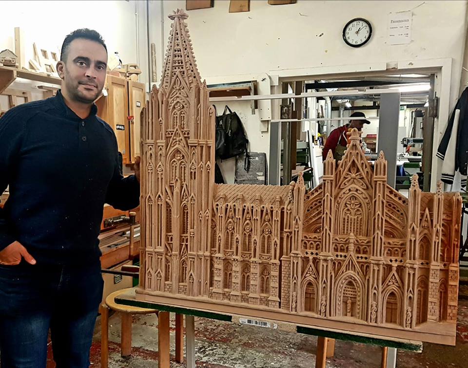 وكشف محدثنا أنه بصدد إنجاز لوحة بارتفاع 2 م وعرض 2 م تمثل مبنىً أثرياً عبارة عن كاتدرائية يعود تاريخها إلى 800 سنة وسيظهر فيها-كما يقول- كل التفاصيل الإنشائية والزخرفية، ومن المتوقع أن يستغرق العمل 400 ساعة عمل.