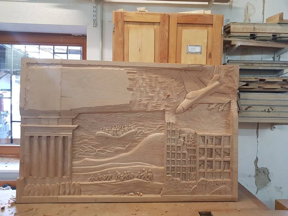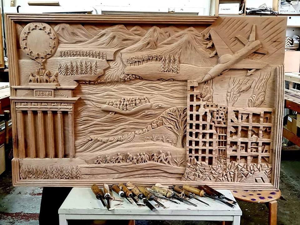 يتطلب الحفر على الخشب مهارات حرفية عالية، إضافة إلى مخيلة واسعة لنحت ما هو مميز لتبدو المنحوتات المنجزة وكأنها لوحات مرسومة بأنامل فنان متقن. والفنان "فاضل الخضر" من الفنانين السوريين الشباب الذين برعوا في هذا المجال، استهوته رائحة الأخشاب منذ الطفولة فاكتسب ملكة التمييز بين أنواعها إن كانت من "الزان" أو "الدلب" أو"السنديان" أوغيرها، وعندما كبر بدأ يتعامل مع هذه الأخشاب في تصميم الموبيليا وقطع الأثاث والتزيين، غير أن طموحه كان أكبر من ذلك، إذا بدأ يتعامل مع سطوح الخشب الصماء ليحولها إلى لوحات فنية تحمل لمسات الإبداع، ومنها لوحته التي نفذها على خشب الزان وعبّر فيها عن رحلة لجوئه الشاقة من سوريا إلى تركيا والبلاد العربية وصولاً إلى أوروبا مختزناً فيها الكثير من الدلالات والرموز الفكرية والفنية بإحساس فني لا يخفى على كل ذي نظر.