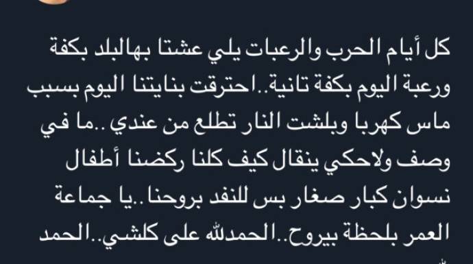 وكتبت البكري على صفحتها الشخصية في "فيسبوك": "كل أيام الحرب والرعبات يلي عشتا بهالبلد بكفة ورعبة اليوم بكفة تانية.. احترقت بنايتنا اليوم بسبب ماس كهربا وبلشت النار تطلع من عندي.. ما في وصف ولا حكي ينقال كيف كلنا ركضنا أطفال نسوان كبار صغار بس للنفد بروحنا.. يا جماعة العمر بلحظة بيروح.. الحمدلله على كلشي.. الحمد لله".
