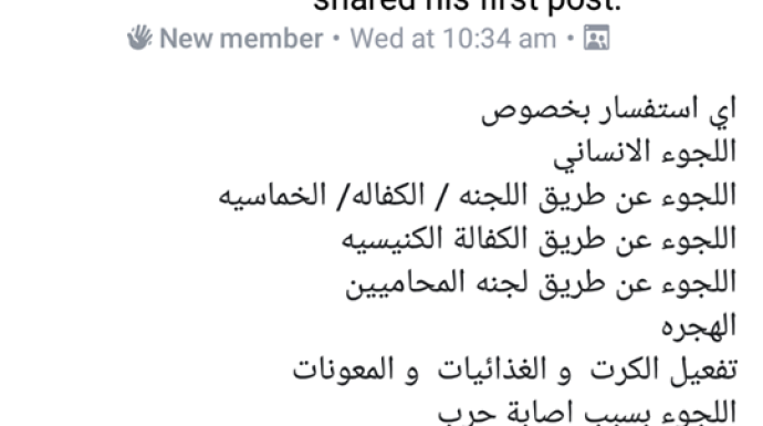 في منشوراته التي اصطاد بها ضحاياه على هذه المجموعة بدأ الترويج لنشاطاته بالإشارة إلى أن الاستفسارات مجانية حول كل ما يخص اللجوء بأنواعه، بدءاً بلم الشمل، وصولاً للمساعدات الغذائية والمالية المقدمة من مفوضية اللاجئين، ليتفاعل معه السوريون بعشرات التعليقات والأسئلة.