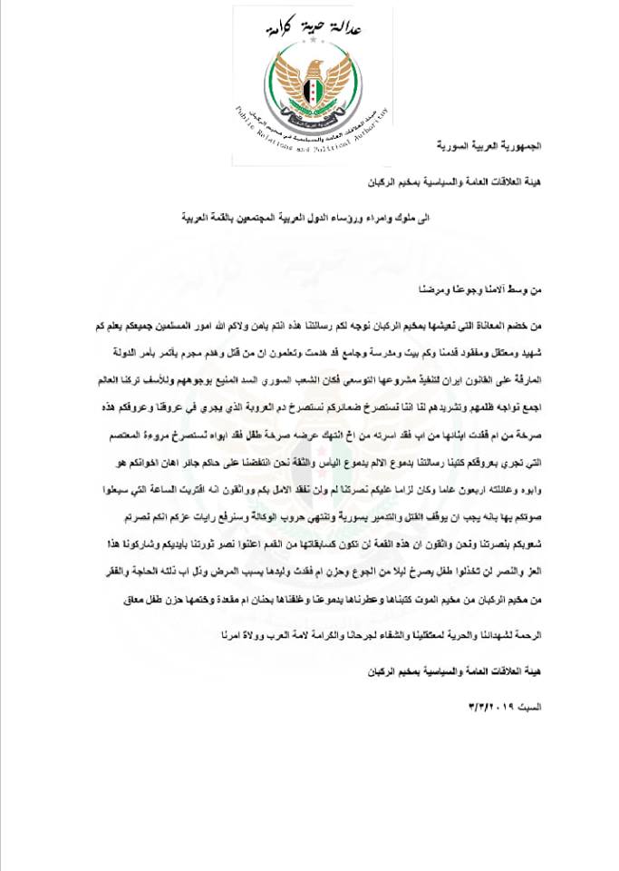 "كان لزاماً عليكم نصرتنا"، بهذه الكلمات خاطب نشطاء مخيم الركبان ملوك وأمراء ورؤساء الدول العربية المجتمعين في القمة العربية بتونس.