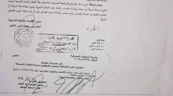 وكانت وسائل إعلام موالية للنظام قد نشرت صورة عن كتاب موجه من وزارة الاقتصاد إلى وزارة الخارجية والمغتربين، تبلغه فيها قرارها بالموافقة على إدخال البضائع المستعملة المسموح استيرادها بموجب فاتورة مصدقة من غرفة تجارة بلد المنشأ واتحاد غرف التجارة السورية وبدون شهادة منشأ، شريطة أن تتضمن الفاتورة بلد المنشأ والمصدر واسم مصدر البضاعة واسم الصانع.