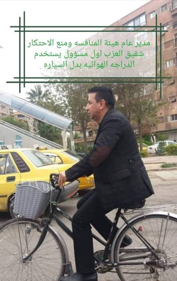 تداولت صفحات على مواقع التواصل الاجتماعي صورة لمدير عام هيئة المنافسة ومنع الاحتكار، والذي يدعى شفيق العزب، وهو يقود دراجة هوائية ويتوجه إلى عمله، في دعوة صريحة للسوريين، بأنه ها هم المسؤولون الذين تنتقدونهم، لديهم الاستعداد للتكيف مع فقدان مادة البنزين، والعودة إلى العصر الحجري.