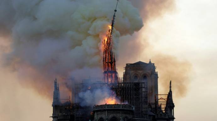 ووعد الرئيس ايمانويل ماكرون بإعادة بناء الصرح التاريخي بعد انهيار برج وسقف الكاتدرائية ليل الاثنين الثلاثاء في الحريق الذي يعتقد أن سببه أعمال الترميم في الكاتدرائية.