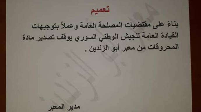 وعلى خلفية الجدل والانتقادات، أعلنت إدارة معبر "أبو الزندين" عن وقف تصدير المحروقات إلى مناطق النظام.