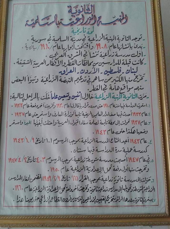 تُعد الثانوية المهنية الزراعية في السلمية (30 كم شرق حماة)، أول مدرسة زراعية تأسست في سوريا، وثالث مدرسة زراعية في الوطن العربي بعد مدرسة "الدرسخانة الملكية" في مصر (1830م)، و"المدرسة الخضيرية" في فلسطين. إذ يعود تأسيسها إلى عام 1910.