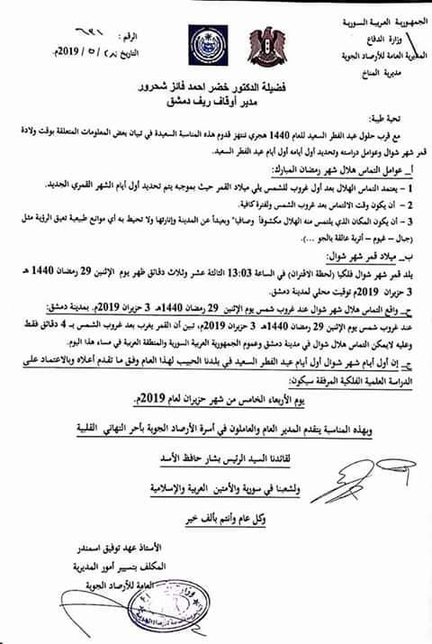 وجهت مديرية المناخ في المديرية العامة للأرصاد الجوية التابعة للنظام، كتاباً لمديرية أوقاف دمشق تخبرها فيه بأن أول أيام عيد الفطر هو يوم الأربعاء، الموافق 5 حزيران القادم.