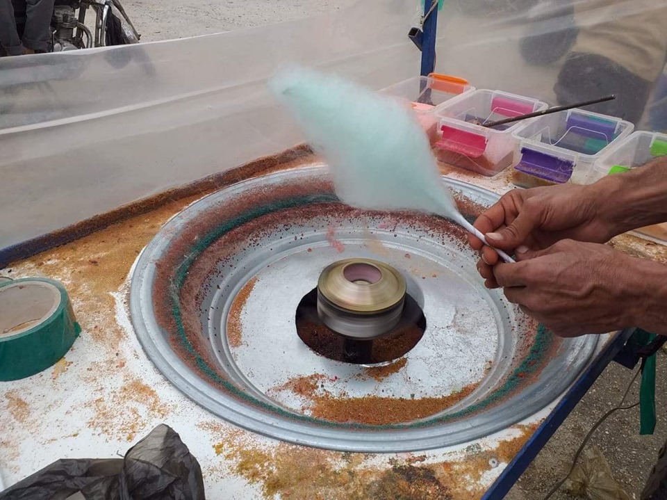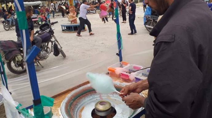 "أبو ضياء" وهو نازح من ريف حماة أعد عربته الصغيرة لبيع "غزل البنات" وحجز مكاناً بساحة العيد الكبيرة في مدينة إدلب ليتهافت عليه عشرات الأطفال لتذوق الغزلة اللذيذة.