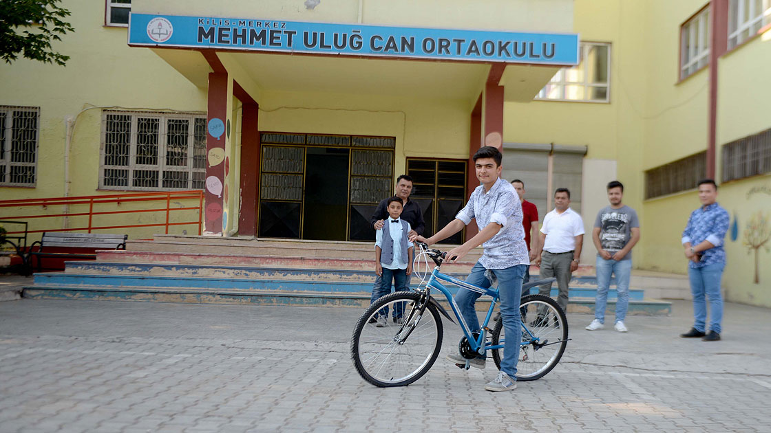 وبنفس السياق، أهدى المدير دراجة هوائية للطالب السوري محمد للنجاح الذي حققه في الامتحان.