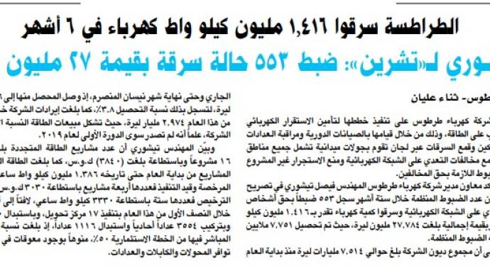 وجاء بالخبر المنشور تحت عنوان (الطراطسة سرقوا 1,416 مليون كيلو واط كهرباء في 6 أشهر) أنه تم ضبط 553 حالة سرقة بما قيمته 27 مليون ليرة سورية، وتم تحصيل 7.751 ملايين ليرة من قيمة الضبوط المنظمة.