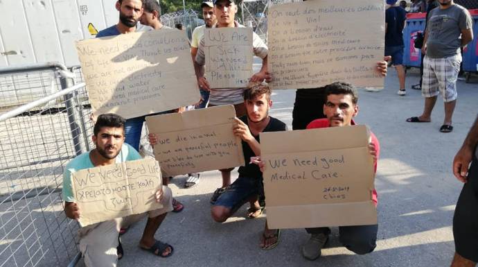 خرج اللاجئون في مخيم "فيال" الواقع في جزيرة "كيوس" اليونانية، والذين يشكل السوريون منهم، النسبة الأكبر، خرجوا في مظاهرة يوم الاثنين 26 آب/ أغسطس الجاري، ينددون فيها بالمعاملة السيئة التي يتعرضون لها من قبل السلطات اليونانية إضافة إلى انعدام الخدمات ضمن المخيم.