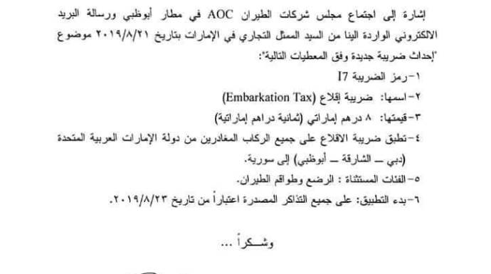 صدر تعميم عن إدارة مؤسسة الطيران السورية، الخاضعة للنظام، يفيد بفرض ضريبة جديدة باسم "ضريبة إقلاع"، تُفرض على جميع الركاب المغادرين من دولة الإمارات العربية المتحدة (دبي – الشارقة – أبوظبي)، إلى سوريا.