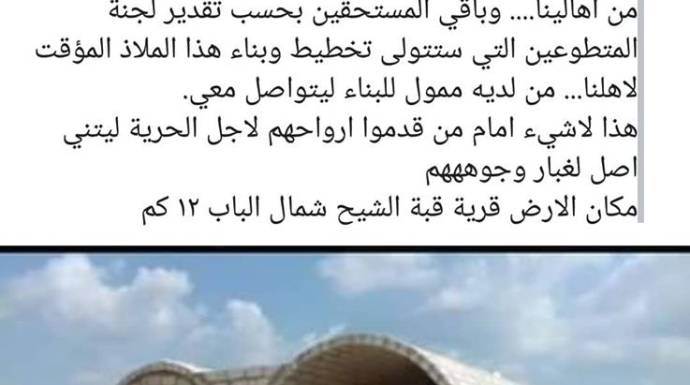 وختم أن هذه المبادرة هي امتحان للسوريين من أبناء الثورة لإنقاذ أهلهم من الخيام والعيش في العراء والجشع، وفي حال نجاح العمل يمكن إسكان كل المهجرين بجهود سوريّة مخلصة.