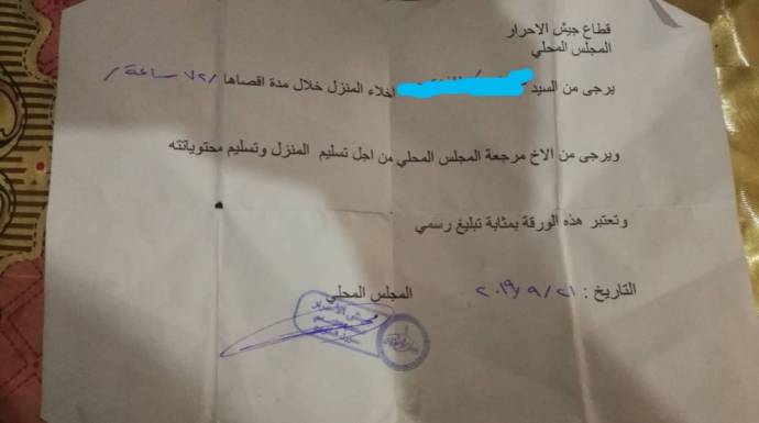 "سأتعرض للضرب والإهانة إن لم أخرج من المنزل خلال المدة الممنوحة للإخلاء كما فعلوا بأحد جيراني"، بهذه العبارات بدأ "أبو علي"، المُهجّر من ريف دمشق، الحديث عن المُهلة التي تم منحه إياها لإخلاء المنزل الذي يقطن فيه خلال مدة أقصاها 72 ساعة، كما ورد في الإشعار من قبل فصيل جيش الأحرار، في بلدة الفوعة بريف إدلب الشمالي.