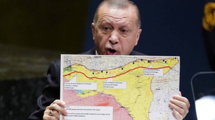 وتظهر خريطة أردوغان أنه سيتم تسكين مليون لاجئ سوري في شمال شرق سوريا لكنه أبلغ الجمعية العامة للأمم المتحدة أن مزيدا من اللاجئين، الذين سيصلون لنحو مليونين، يمكن أن يستوطنوا تلك المنطقة بمجرد استيلاء القوات التركية عليها.