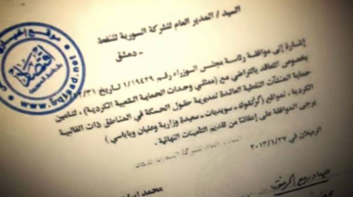 وحسب إحدى الوثائق، الصادرة عن مدير عام الشركة السورية للنفط، بتاريخ 27/1/2013، تتم الإشارة إلى موافقة مُسبقة صادرة عن مجلس وزراء النظام على التعاقد بالتراضي مع وحدات حماية الشعب الكردية، لحماية عدد من الآبار النفطية شمال شرق البلاد.