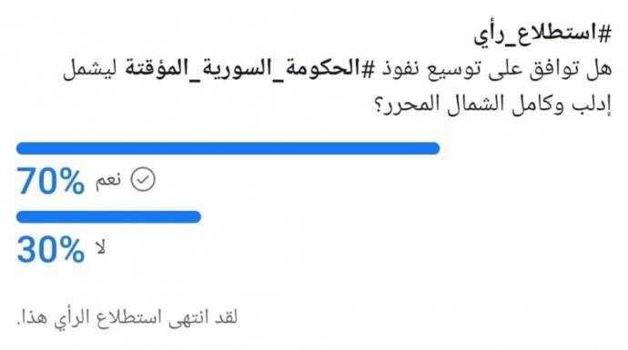 وشارك في الاستطلاع الذي طرح سؤالاً حول الموافقة على بسط الحكومة المؤقتة المدعومة من تركيا سيطرتها على إدلب، 2193 شخصاً.