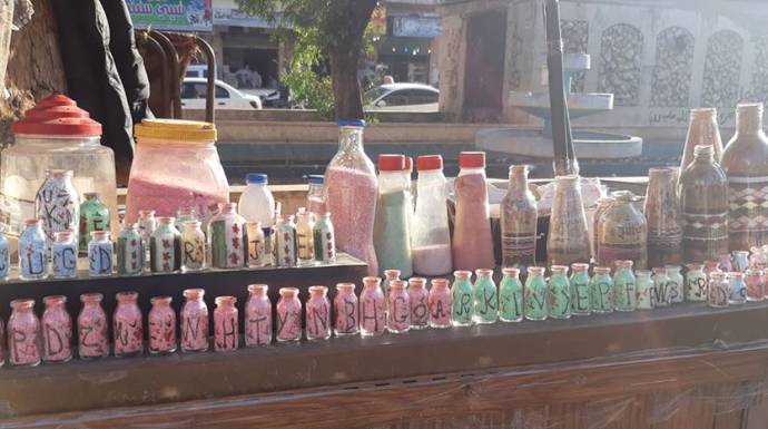 في وسط المدينة، وعلى بسطة صغيرة، يوزّع "أبو أحمد التدمري" زجاجات رماله الملونة، ليرسم الأمل والتفاؤل على وجوه الناس، برسومات وأشكال جميلة من الرمال الملونة، في زجاجات مستعملة، يمنحها منظراً يشد أعين الناظرين إليها.