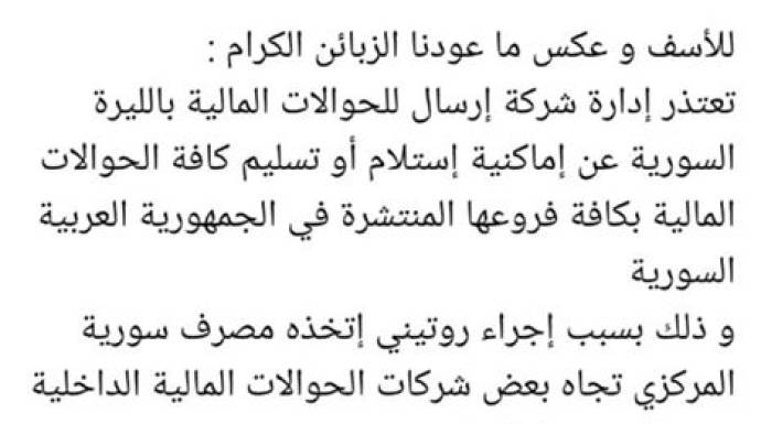 ومن بين تلك الشركات، شركة "إرسال للحوالات المالية الداخلية بالليرة السورية"، والتي نشرت إدارتها بياناً على صفحتها الرسمية في "فيسبوك"، يوم الجمعة، جاء فيه: "للأسف وعكس ما عودنا الزبائن الكرام، فإن إدارة شركة إرسال للحوالات المالية بالليرة السورية، تعتذر عن إمكانية استلام أو تسليم كافة الحوالات المالية بكافة فروعها المنتشرة في الجمهورية العربية السورية، وذلك بسبب إجراء روتيني اتخذه مصرف سورية المركزي تجاه بعض شركات الحوالات المالية الداخلية ومن ضمنهم شركتنا، وسنقوم بإعلامكم عبر مراكزنا المنتشرة على كافة الأراضي السورية أو صفحتنا على الفيس بوك بوقت معاودة نشاط الشركة".