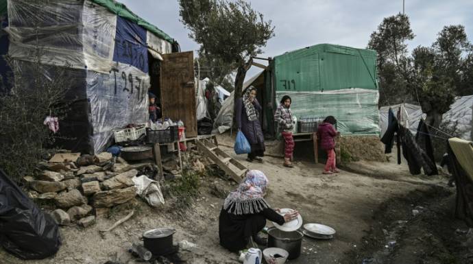 امرأة تغسل اطباقاً في مخيم مؤقت قرب مخيم موريا للاجئين في جزيرة ليسبوس في 21 كانون الثاني/يناير 2020
