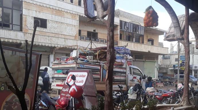 وعلى طريق معرة مصرين توقفت سيارات (بيك آب) كبيرة تحمل عشرات النساء والأطفال وكميات كبيرة من الأثاث للبحث عن بيوت للإيجار.