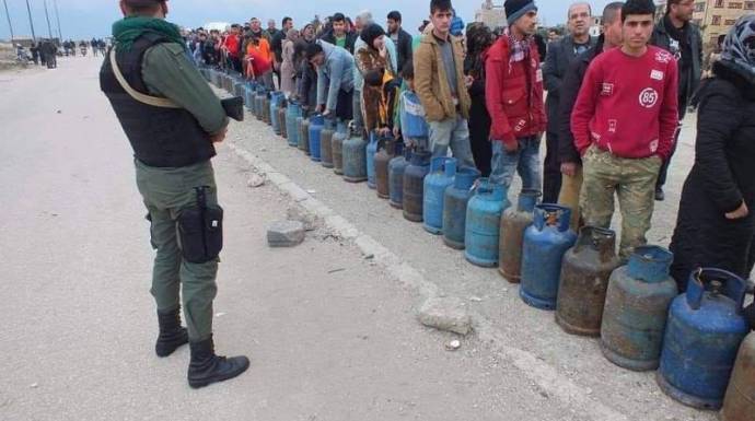 وفيما يخص المحروقات، من غاز ومازوت، توقفت وسائل الإعلام تقريباً، عن ذكر الأزمات فيما يخص توزيع هاتين المادتين، وأعلنت على لسان مدير شركة المحروقات، الذي يدعى مصطفى حصوية، أنها استطاعت أن تكافح الفساد، وتحقق الاستقرار، بحيث لم يعد هناك من يصطفون في أدوار طويلة للحصول على أسطوانة غاز، وأن الأزمة في طريقها إلى الحل.. بينما وصلت إلى "اقتصاد" صور حديثة من حلب، تظهر الناس وهم يصطفون في دور طويل، وكل منهم يستند إلى اسطوانة غازه الفارغة، بانتظار تبديلها.
