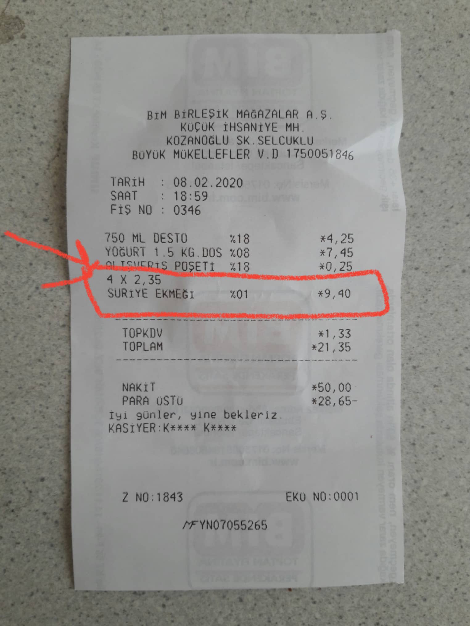 في مدينة قونية التركية يقوم مخبز سوري بالتعاقد مع سوبر ماركت "البيم =”BiM" - وهي أشهر "سوبرماكت" منتشرة في كل المدن والبلدات التركية بشكل عام، وتشهد إقبالاً كبيراً من السكان نظراً لجودة ورخص البضائع المتنوعة فيها بشكل عام-. ويقوم المخبز السوري بتزويد "البيم" بخبز سوري مكتوب على الكيس "الخبز السوري" والمفترض أن يكون وزن الربطة (600) غرام وبسعر(2.10) ليرة تركية، ولكن بعد رفع أسعار الخبز السوري تم رفع سعر الخبز السوري في "البيم" إلى (2.35) ليرة تركية لنفس الوزن.