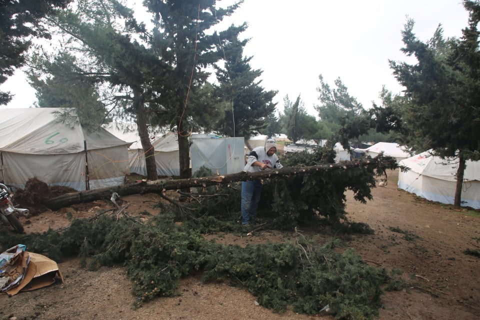 وأضاف: "المخيم يحتوي قرابة 180 خيمة بنيت حديثاً قبل أشهر، في جبل قرب بلدة كفر تخاريم. اليوم اقتُلع منها جراء الرياح القوية المصحوبة بالأمطار قرابة 90 خيمة وتضررت جميع أغراض النازحين حتى الشجر لم يسلم من العاصفة".