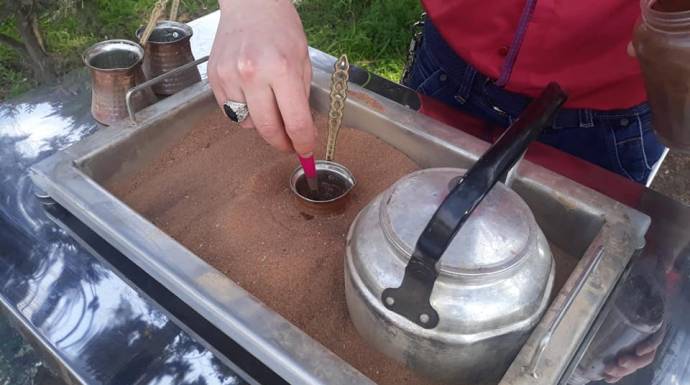 يقول "أحمد" المشغول بتلبية طلبات الزبائن المتحلقين حوله بينما كان الرمل الساخن الذي يستخدمه لغلي القهوة التركية يبعث ببعض الدفء على الحضور، "الجميع يزورون المكان للتنزه والاستمتاع بالأجواء الربيعية هنا.. أقدم لهم القهوة على الرمل إضافة لمختلف المشروبات الساخنة".