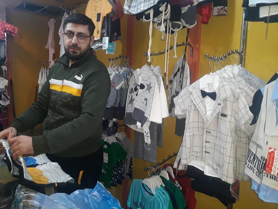 في متجر مزدحم بالزبائن ينهمك "أبو محمد" في بيع الألبسة الخاصة بالأطفال بينما كان العديد من النسوة يستطلعن بضائع تركية أنيقة المنظر معلقة بكثافة في كافة أرجاء المكان.