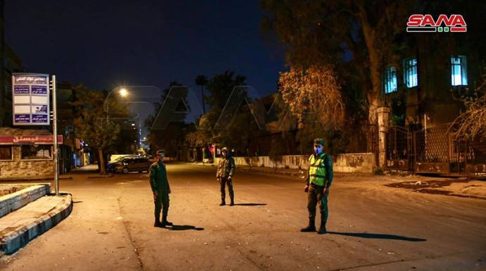(الصورة المرفقة لعناصر أمن أثناء تطبيق الحظر الليلي وفق وكالة "سانا" التابعة للنظام)