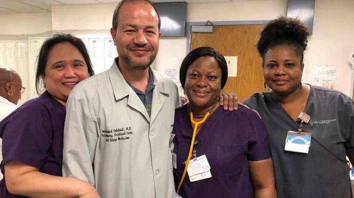 يقول شارحاً طبيعة عمله والمهام الموكلة إليه: "ينقسم عملي الحالي إلى ثلاثة أقسام، الأول علاجي، أي العناية المباشرة بالمرضى بكورونا في مستشفيات عدة في ولاية شيكاغو، والثاني تدريبي للأطباء".