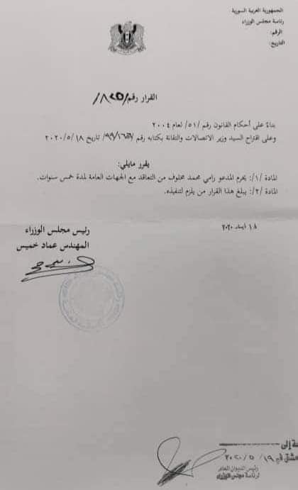 وتشير صورة للقرار المتداول عبر وسائل التواصل والإعلام، إلى أنه صدر يوم الاثنين بتاريخ 18 أيار/مايو، أي قبل صدور قرار الحجز الاحتياطي على أموال مخلوف وزوجته وأولاده، الذي صدر صباح الثلاثاء 19 أيار/مايو.