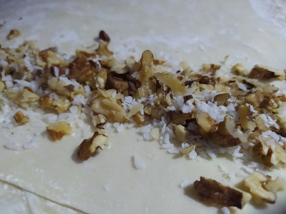 صنعت "أم إياد" رقائق من العجين وقامت بحشوها بالجوز وجوز الهند ثم صبت عليها القليل من القطر.