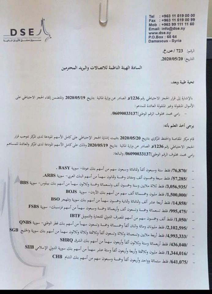 أعلنت سوق دمشق للأوراق المالية، أنها قامت بالحجز على جميع الأسهم العائدة للمدعو رامي مخلوف وجميع أفراد أسرته، وذلك تنفيذاً لقرار الحجز الاحتياطي الذي أصدرته وزارة المالية بالأمس على جميع أموال وممتلكات رامي مخلوف وعائلته المنقولة وغير المنقولة.